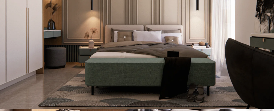 Palet warna yang digunakan didominasi oleh tone netral seperti beige, putih, dan abu-abu, diperkaya dengan sentuhan hijau lembut pada ranjang dan biru mint pada meja sisi tempat tidur. Kombinasi ini menciptakan keseimbangan visual yang menenangkan, cocok untuk ruang istirahat.