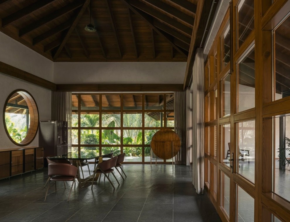Dominasi Kayu yang Hangat: Langit-langit yang tinggi dengan struktur atap ekspos yang seluruhnya terbuat dari kayu berwarna gelap (mungkin jati atau ulin) segera menarik perhatian. Atap berbentuk limas atau joglo modern ini tidak hanya indah secara visual tetapi juga membantu sirkulasi udara alami, kunci dalam arsitektur tropis. Bingkai jendela dan panel dinding kayu dengan warna senada semakin memperkuat nuansa tradisional namun disajikan dalam bingkai geometris modern.