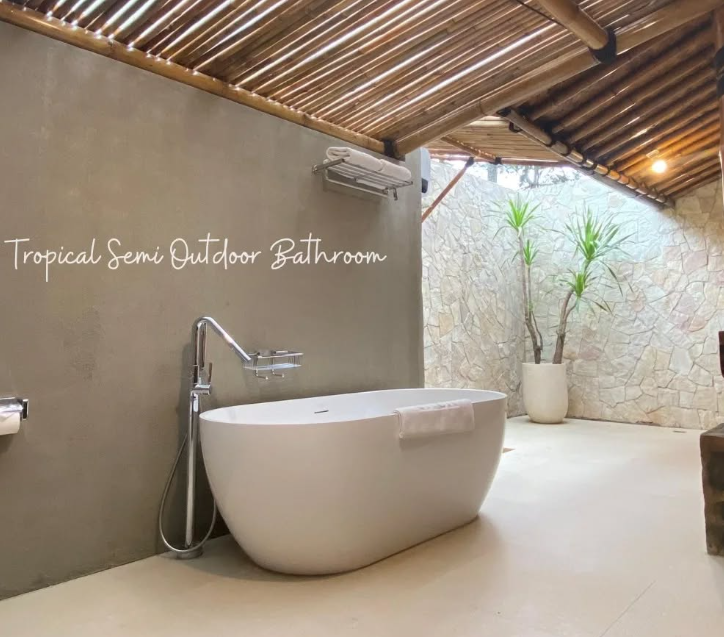 Kamar mandi bukan lagi sekadar ruang untuk membersihkan diri, melainkan juga tempat untuk melepas penat dan menenangkan pikiran. Konsep tropical semi outdoor bathroom seperti yang terlihat pada gambar di atas menghadirkan suasana alami yang hangat dan menyegarkan, seolah menyatu dengan alam tanpa kehilangan kenyamanan modern.