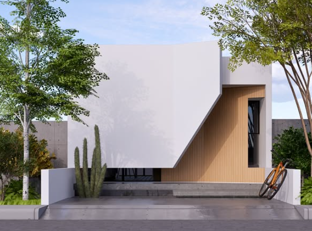 Tampak depan bangunan ini memadukan geometri asimetris dengan permainan bidang tegas dan potongan diagonal yang menciptakan kesan dinamis. Elemen ini memberikan tampilan yang berbeda dari rumah-rumah konvensional yang umumnya simetris dan datar. Pilihan warna monokrom putih berpadu dengan aksen material kayu vertikal menambahkan kehangatan visual sekaligus menyeimbangkan kesan modern yang minimalis.