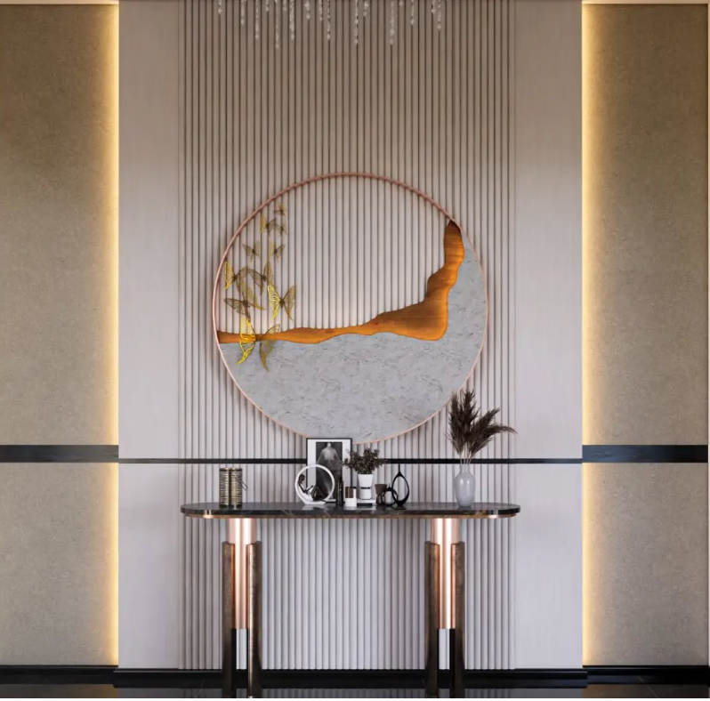 Sentuhan artistik pada lingkaran dinding yang menampilkan kombinasi tekstur batu, logam, dan pola alam menghadirkan nuansa tenang seperti karya seni dinding modern yang menenangkan pandangan.
