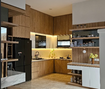 Secara keseluruhan, dapur ini merupakan representasi sempurna dari gaya hidup modern yang fungsional namun tetap estetis. Paduan material alami, pencahayaan hangat, dan desain yang tertata dengan cermat menciptakan suasana dapur yang tidak hanya indah dipandang, tetapi juga nyaman digunakan setiap hari.