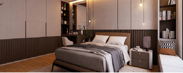 Kamar tidur ini menghadirkan perpaduan sempurna antara kenyamanan dan estetika modern. Dominasi warna netral seperti cokelat, abu-abu, dan krem menciptakan suasana yang tenang dan menenangkan—ideal untuk ruang istirahat pribadi.
